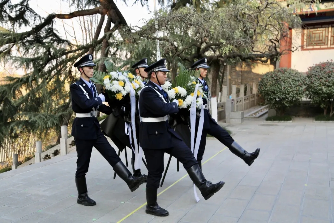 拾级而上,国旗护卫队成员向烈士纪念碑敬献花圈,表达对革命英烈的深重哀悼与缅怀。