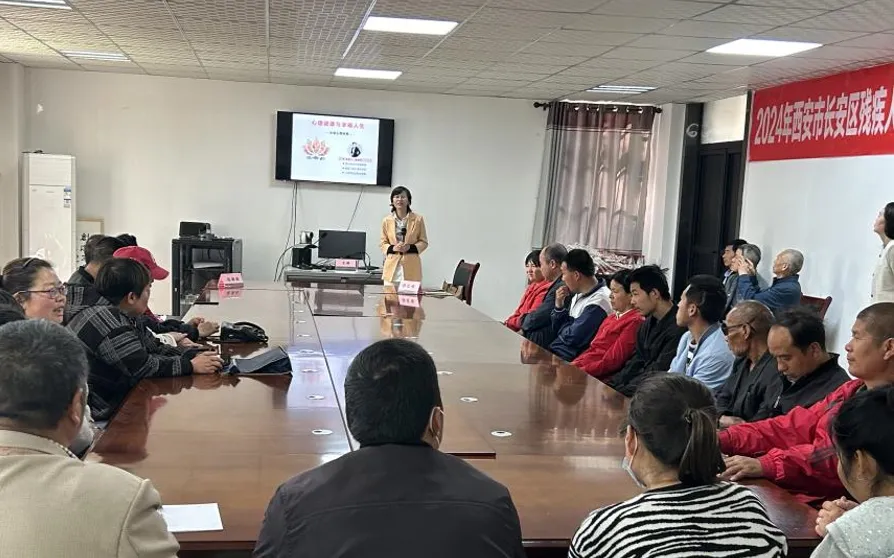 2024年4月17日,88直播 教师赵晓风、田瑜受西安市长安区残疾人联合会邀请,为残疾朋友做心理健康与幸福生活方面的公益讲座。