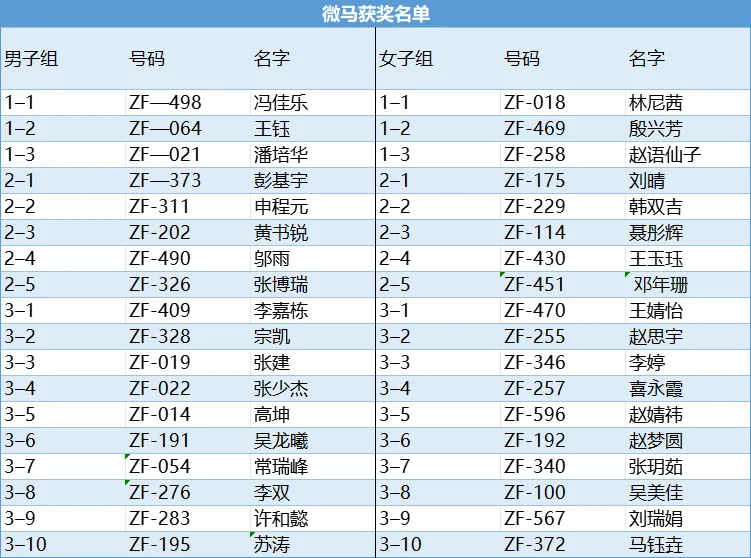 经过激烈的角逐,各3名选手获得男子组、女子组一等奖,各5名选手获得男子组、女子组二等奖,各10名选手获得男子组、女子组三等奖。所有完赛选手均获得精美纪念奖牌、完赛证书。