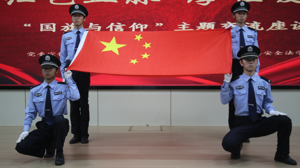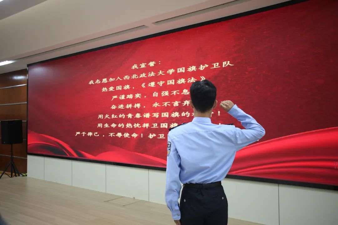 西北政法大学国旗护卫队预备役队员们庄严地进行入队宣誓,每一句掷地有声的誓言都透露着他们对国旗的无限热爱与护卫国旗的坚定信念。他们所守护的,不仅仅是那面飘扬的五星红旗,更是一份矢志不渝的信仰和永不褪色的忠诚。
