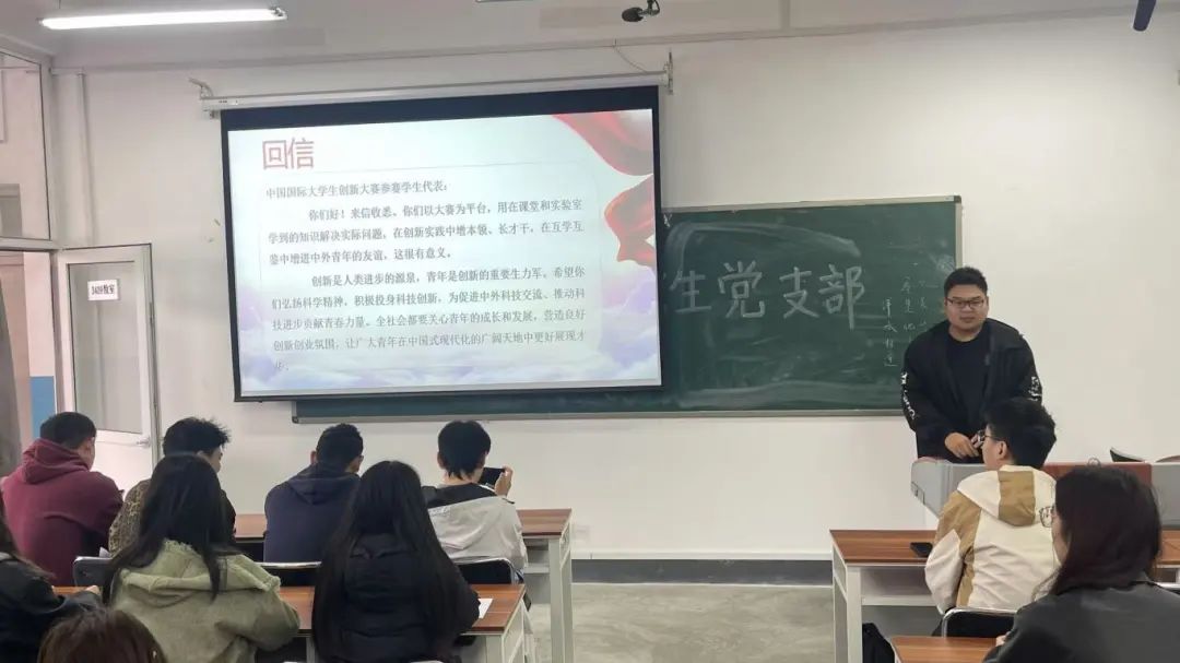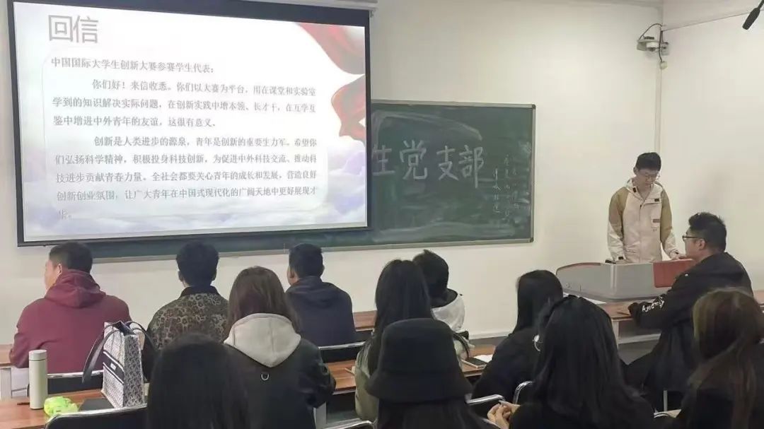 2024级研究生朱金帝同学以自身参与本次中国国际大学生创新大赛的经历为依托,深入浅出地阐述了对回信精神的理解与认识,以及创新对国家富强、社会进步、青年成长的重要意义。2024级研究生张子健同学带领与会党员学习习近平总书记在回信中特别强调的青年与创新工作的内涵,通过讲述习近平总书记多次对青年提出的殷切希望,鼓励支部成员以聪明才智贡献国家,以开拓进取服务社会,承担起强国有我的青春责任。2024级研究生袁毓琛同学带领与会党员学习习近平总书记给中国海洋大学全体师生的回信精神,着重强调青年在科技强国中的担当,激发大家的爱国热情和责任感。