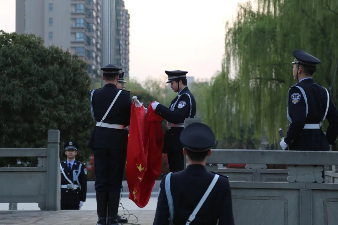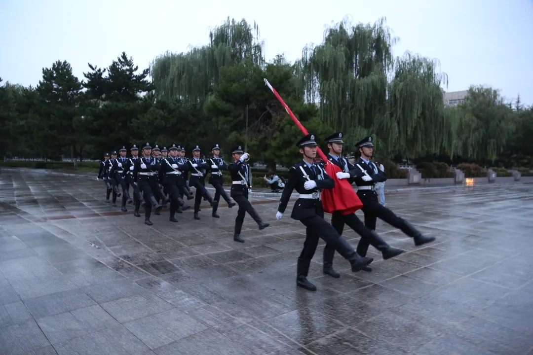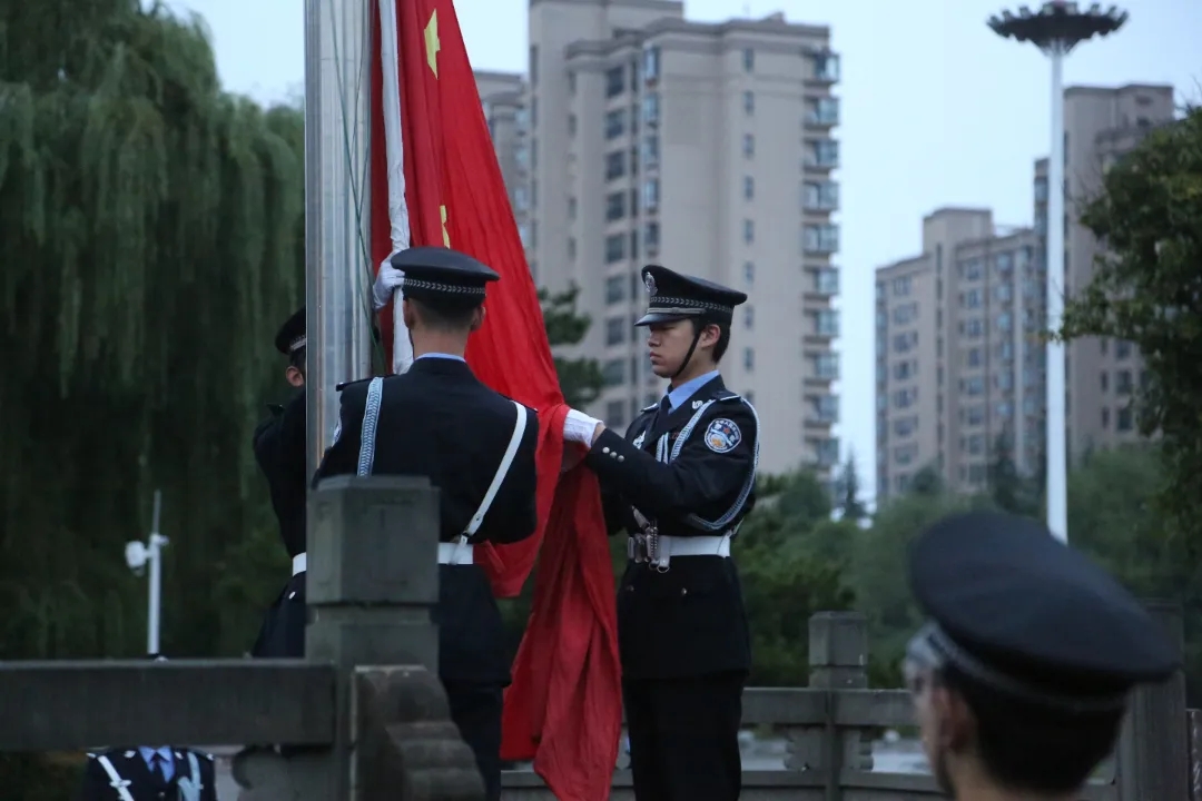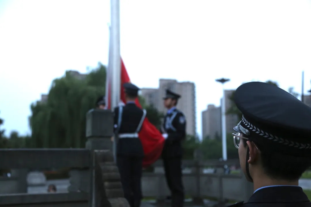 细雨濛濛,秋风习习。英姿飒爽的国旗护卫队员手擎国旗,迈着铿锵坚定的步伐阔步向前,穿过雨后的晨雾。随着国旗冉冉升起,全体公安学子面向国旗敬礼,流露出他们对祖国的热忱之情,洋溢出他们对祖国的热爱之意。