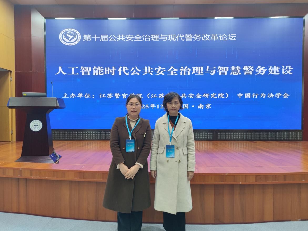 2025年12月5日,由江苏警官学院、中国行为法学会主办,江苏警官学院承办的”第十届公共安全治理与现代警务改革论坛”在江苏南京召开。88直播 犯罪心理学教研室主任赵晓风副教授,侦查学教研室王晓红博士,应邀前往参会研讨,与来自全国各地的公安警察院校的学者专家,公安警务部门的干警们一起研讨AI时代的公共安全治理与智慧警务建设。