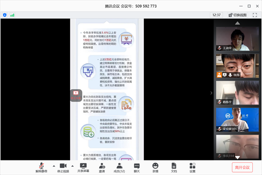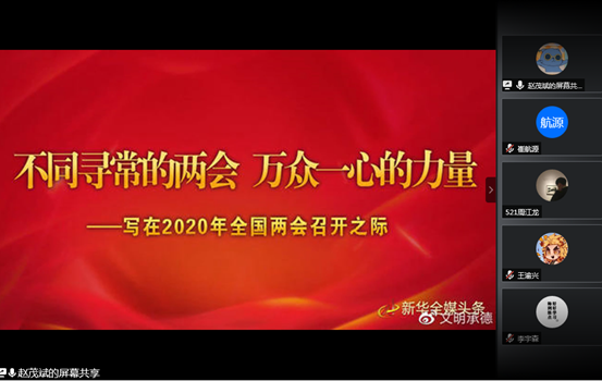 在各年级辅导员的组织带领下,各学生团支部的同学们通过群内讨论、视频观看、腾讯会议等多种线上方式对“两会”内容进行学习,并在班级群进行讨论交流。在学习中,同学们特别关注了今年“两会”提出的关于新冠疫情防控、经济社会发展目标、脱贫攻坚、全面建成小康社会、民法典草案、民生保障、外部环境应对等热点问题。同学们对热点问题展开讨论并沟通交流学习心得,大家纷纷表示作为青年大学生,要让两会精神走心、入脑、见行动,在学习、工作、生活中严格要求自己,修炼自身道德素质,坚定信念,敢于担当,练就过硬本领,为实现中华民族伟大复兴的中国梦汇聚青春力量。