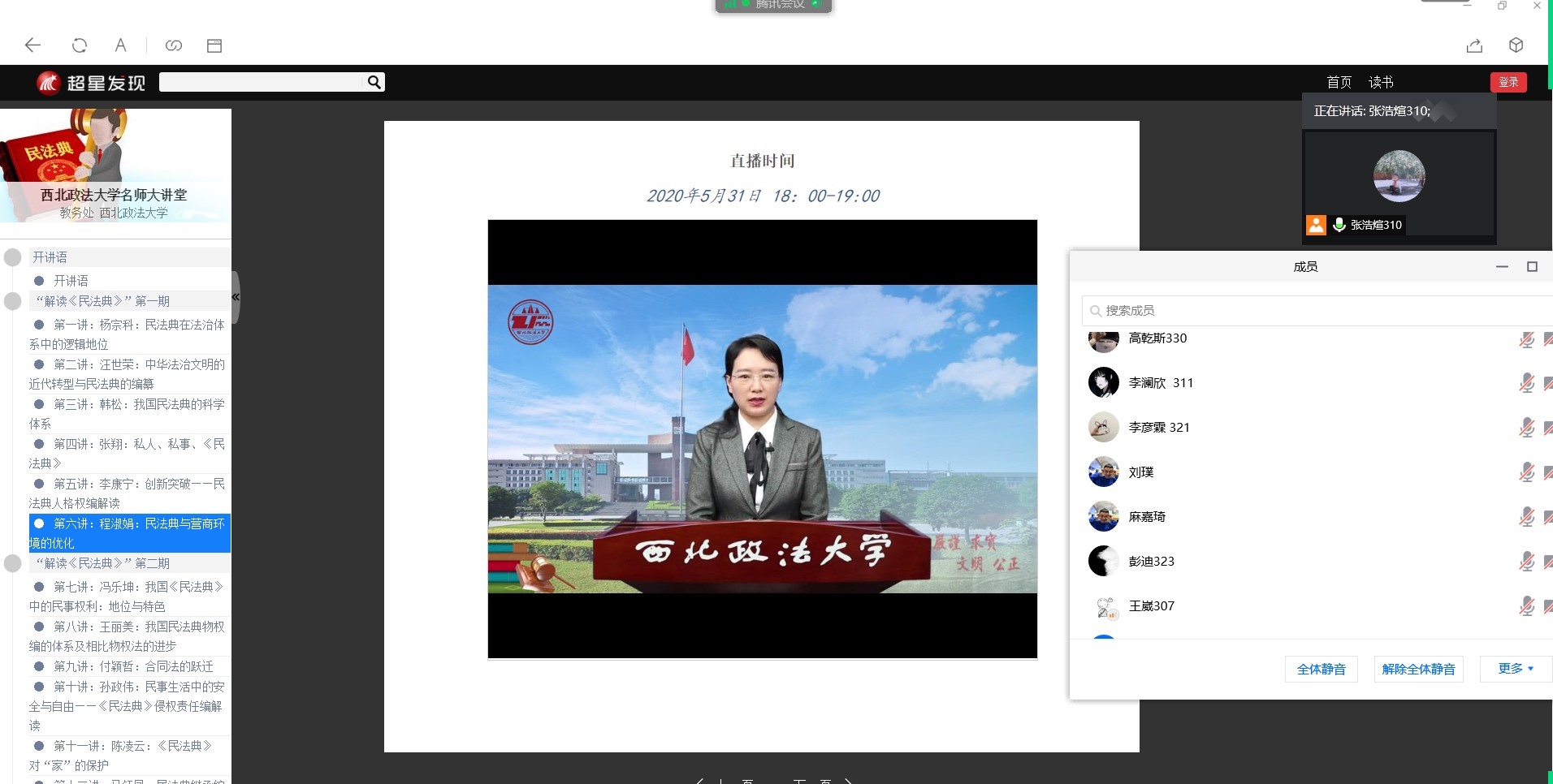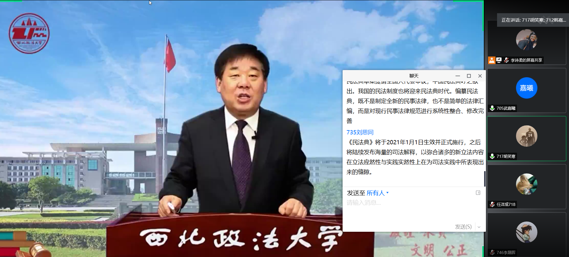 2019级学生通过腾讯会议又重温了杨宗科校长等一众教授对《民法典》讲解的在线直播课。通过对《民法典》的学习,大家了解到民法典是被称为关系每一个普通老百姓从出生到坟墓的一部法律,所以新中国的第一部民法典通过备受全国老百姓关注。《中华人民共和国民法典》被称为“社会生活的百科全书”,是新中国第一部以法典命名的法律,在法律体系中居于基础性地位,也是市场经济的基本法。民法典共7编、1260条,各编依次为总则、物权、合同、人格权、婚姻家庭、继承、侵权责任,以及附则。