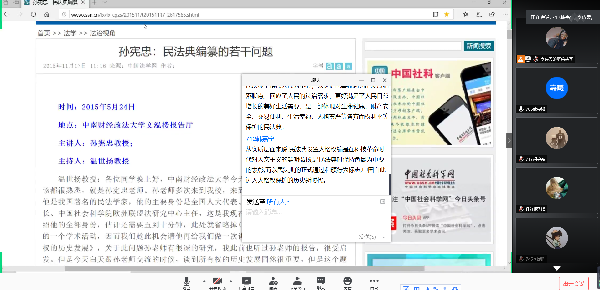 2017级的全体同学们通过观看我校名师组织同学们观看我校名师大讲堂系列视频,同学们共同进行线上学习,班内探讨,发表自己的观点和看法。同时组织同学们阅读我校知名校友孙宪忠教授有关于《民法典》编撰的相关问题,深入了解《民法典》从开始到实施的过程,并且进行讨论,相互学习。同学们利用课余时间,积极配合学习,各抒己见,发表自己的看法,是当代大学生们更加关注民生,也为专业课学习提供了更多的实践内容,充实了同学们的课余学习和生活。