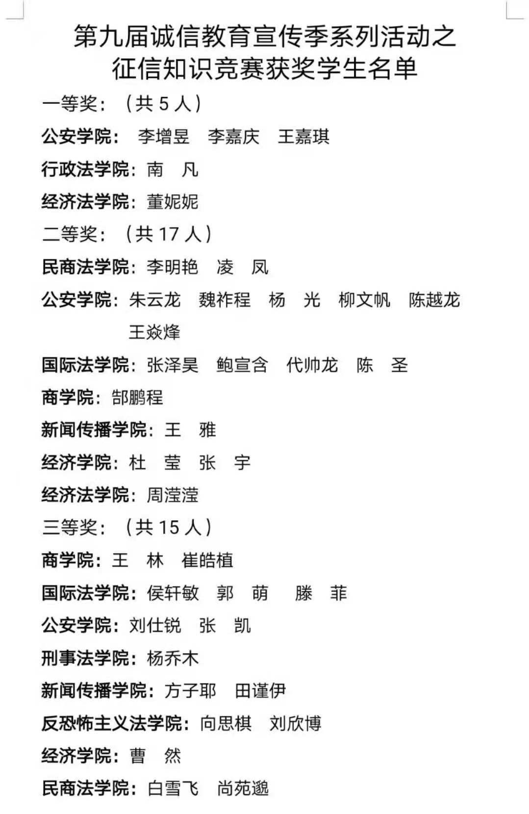 根据我校《第十三届心理健康教育暨第九届诚信教育宣传季系列活动安排》的工作要求,4月16日,我校开展了第九届诚信教育宣传季系列活动之征信及资助政策知识竞赛。88直播 3人获得一等奖,6人获得二等奖,2人获得三等奖,共计11名同学在本次竞赛中获奖,取得佳绩。