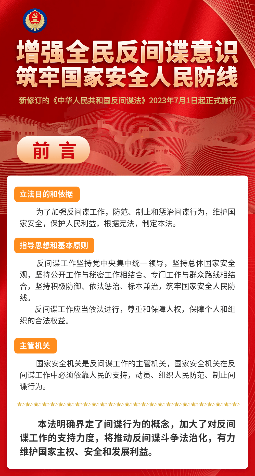 为了防范、制止和惩治间谍行为,维护国家安全,保护人民利益,我国新修订的《中华人民共和国反间谍法》将于2023年7月1日起正式施行。一图速览带你读懂《反间谍法》。